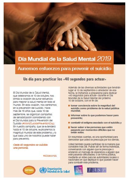 Esta efeméride, que anualmente busca visibilizar la importancia de la salud mental para el bienestar de las personas, ha servido para el lanzamiento de la campana de la OMS “40 segundos para actuar”, dirigida a ofrecer a la población común y a las y los profesionales de la salud información útil para contribuir a la prevención del suicidio.