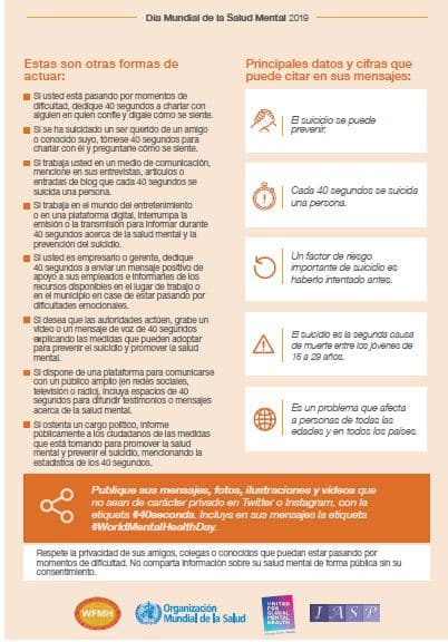 Registros de la OMS precisan que una persona se suicida en el mundo cada 40 segundos, y es por eso que la campaña ha puesto el foco en las acciones que pueden hacerse durante ese pequeño lapso de tiempo y que podrían contribuir a evitar un nuevo incidente.